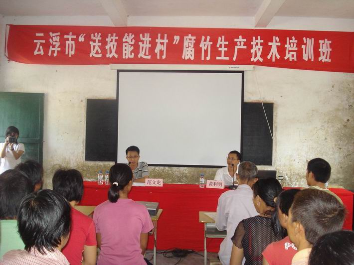 为积极响应省委、省政府关于促进农村劳动力就业和农民增收的号召,学习先进腐竹生产技术,改善传统腐竹工艺,8月21日上午,云浮市“送技能进村”腐竹生产技术培训班在石城镇云星小学举行。市、县劳动保障局和石城镇有关领导,有关村党员干部以及从事腐竹行业的生产商约150人参加了培训。