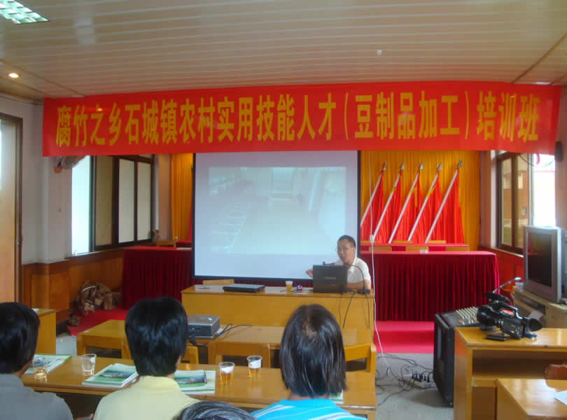 培训班邀请了广东江门食品工程师黄利明教授进行主讲,他表示,石城镇托洞腐竹具有一定知名度,但生产技术相对落后,还停留在传统的生产水平,距离国际标准还有一段距离,要提高生产效率,占有一定的市场份额,学习先进的生产技术已成为时代的要求。他以深入浅出、通俗易懂的语言,全面系统、详细地介绍了从事腐竹生产的各项技术:从如何筹建一个符合QS要求的腐竹厂开始,到各种生产设备、配套设施的如何合理布局;从如何选购黄豆、烘干、脱皮、浸豆、磨浆、过滤、煮浆、挑腐竹,到烘干和包装等生产技术;从生产设备的如何正确操作使用,到如何维护保养;从各类生产设备优缺点讲起,到如何正确选购符合当地的实际情况,以最经济的手段改造目前落后的生产设备;从如何做好个人卫生到如何搞好食品质量安全等内容等,他强调要提高生产效率必须要有先进的设备,必须机械化生产,先进的技术依靠先进的设备,提升腐竹产品的档次,并向大家展示了黄豆脱皮机、磨浆机和电动摇浆机、高效节能腐竹机等等。同时他还表示在依靠先进技术的同时必须扩大生产规模,使托洞腐竹走上一条现代化、产业化、规模化的发展道路。